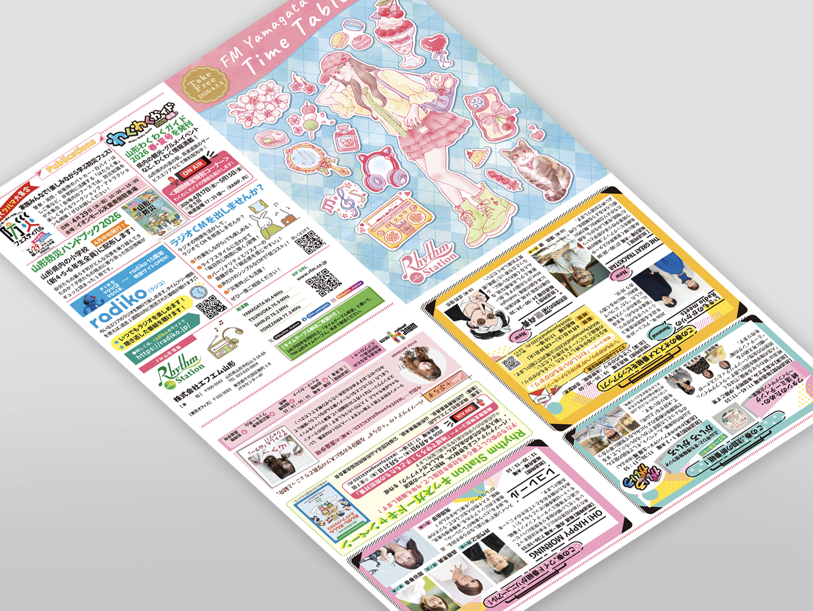 秋葉原、両国、錦糸町、上野、山形県の企業広告印刷デザイン制作は山形県の(株)nanohaへ。山形県の広域ラジオ放送局である「FMやまがた」様のタイムテーブルのイラストレーションとレイアウトデザイン制作を担当しています。季節感やトレンド感のあるアイテムを中心に、シールシート風デザインの表紙に仕上げました。